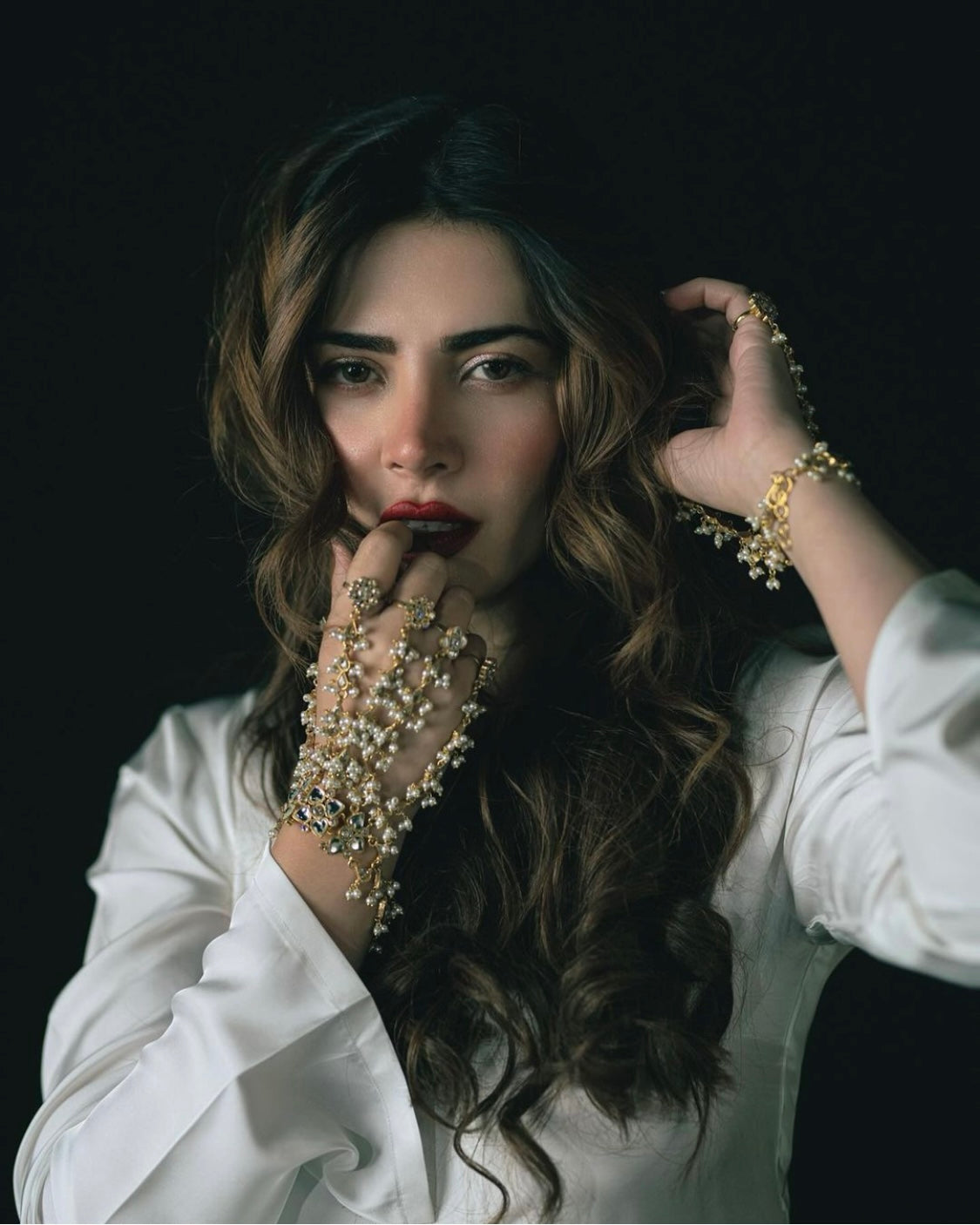 Panjangla for the modern mahrani. Kundan Classics! Amp your bridal look with our gold-plated  kundan handchain encrusted with premium zircons and finished with pearl beads.