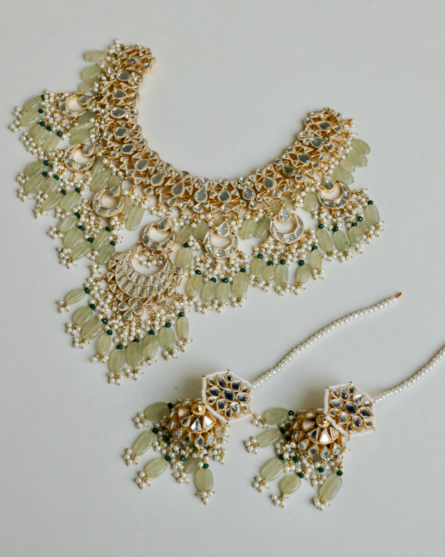 A timeless kundan set crafted in a classic gold-tone finish, featuring delicately hand-set teardrop kundan stones. The necklace is beautifully adorned with soft pistachio-green beads, tiny pearls, and subtle emerald-green accents that add depth and elegance. The crescent-inspired motifs and layered detailing give it a regal yet graceful look. Paired with matching jhumka-style earrings finished with pearl bunches and green bead drops, this set is perfect for weddings, festive occasions, and traditional soirées. A statement piece that blends heritage craftsmanship with refined charm. Gold-plated on high-quality brass as base metal. Approximate earrings length is 3.2”.