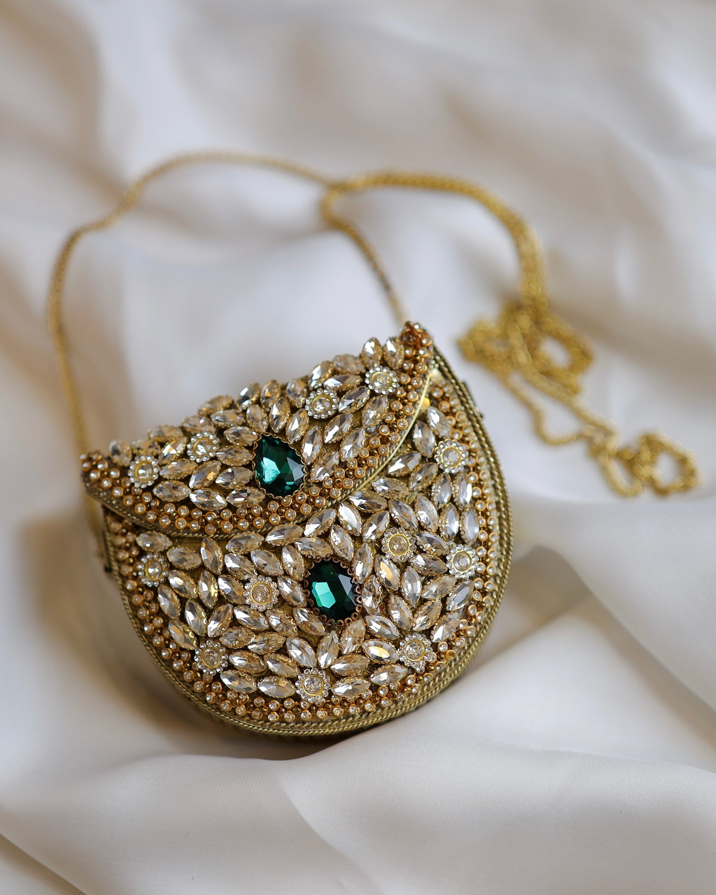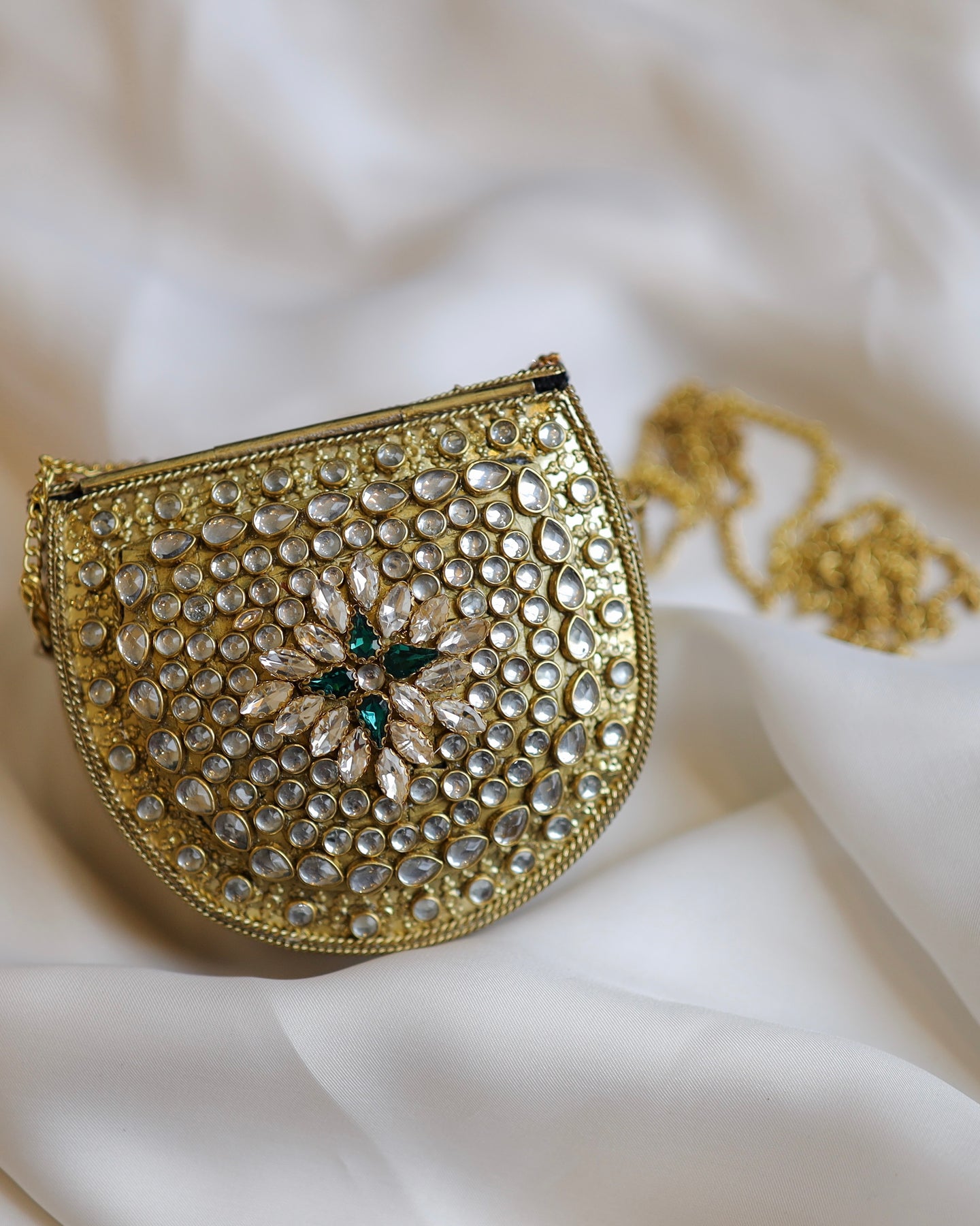 An exquisite jadau clutch featuring hand-set kundan stones, emerald accents, and intricate detailing. Each piece is meticulously crafted using traditional techniques, making it a standout accessory for weddings, festivals, and special occasions. Includes a detachable metallic chain strap and secure magnetic closure. Clutch comes with detachable chain.