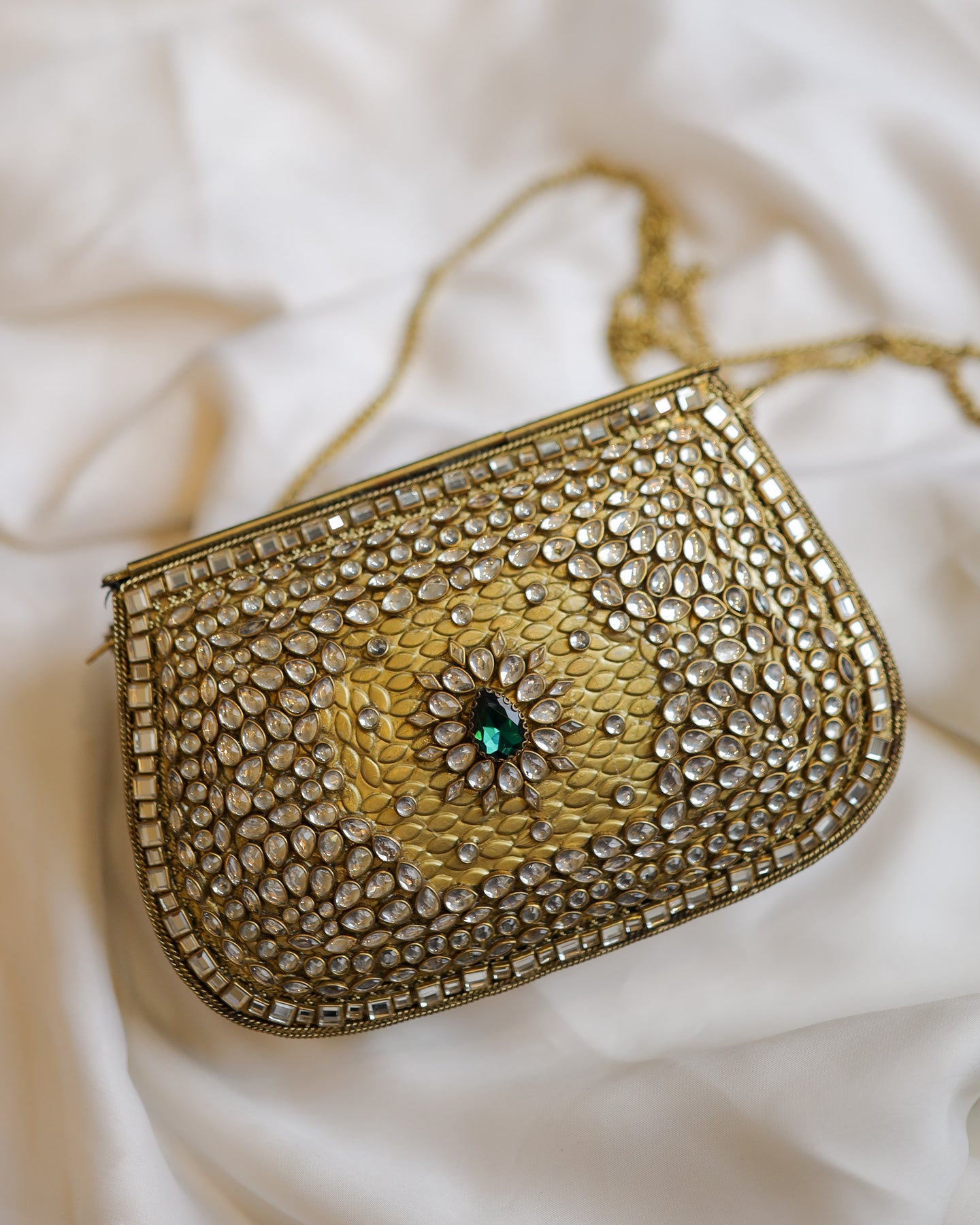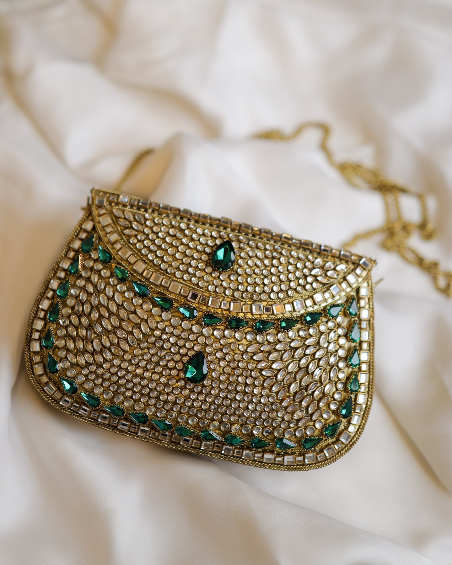 An exquisite jadau clutch featuring hand-set kundan stones, emerald accents, and intricate detailing. Each piece is meticulously crafted using traditional techniques, making it a standout accessory for weddings, festivals, and special occasions. Includes a detachable metallic chain strap and secure magnetic closure. Clutch comes with detachable chain.
