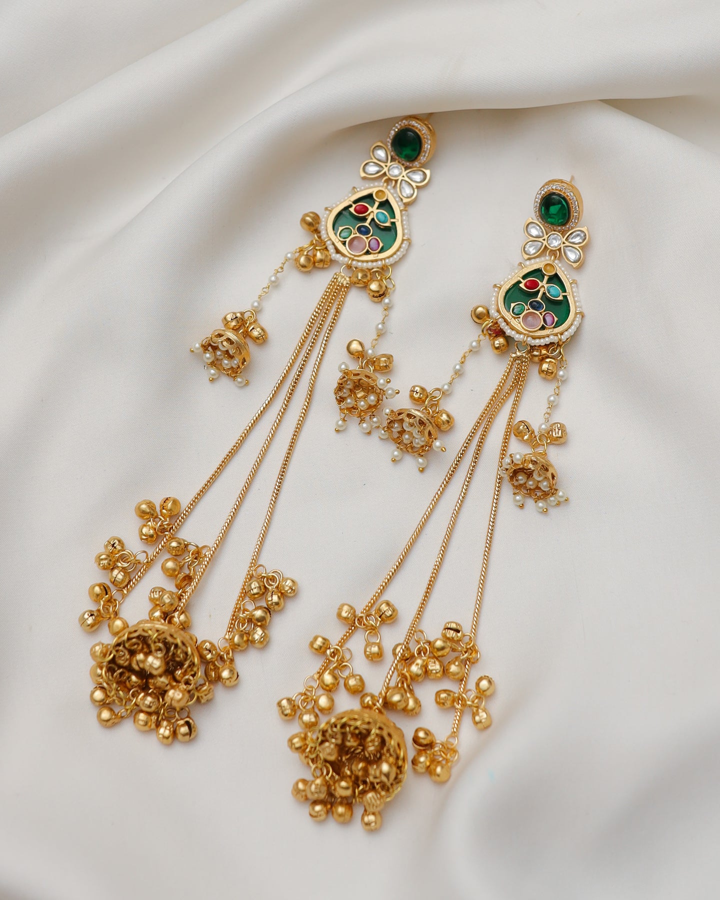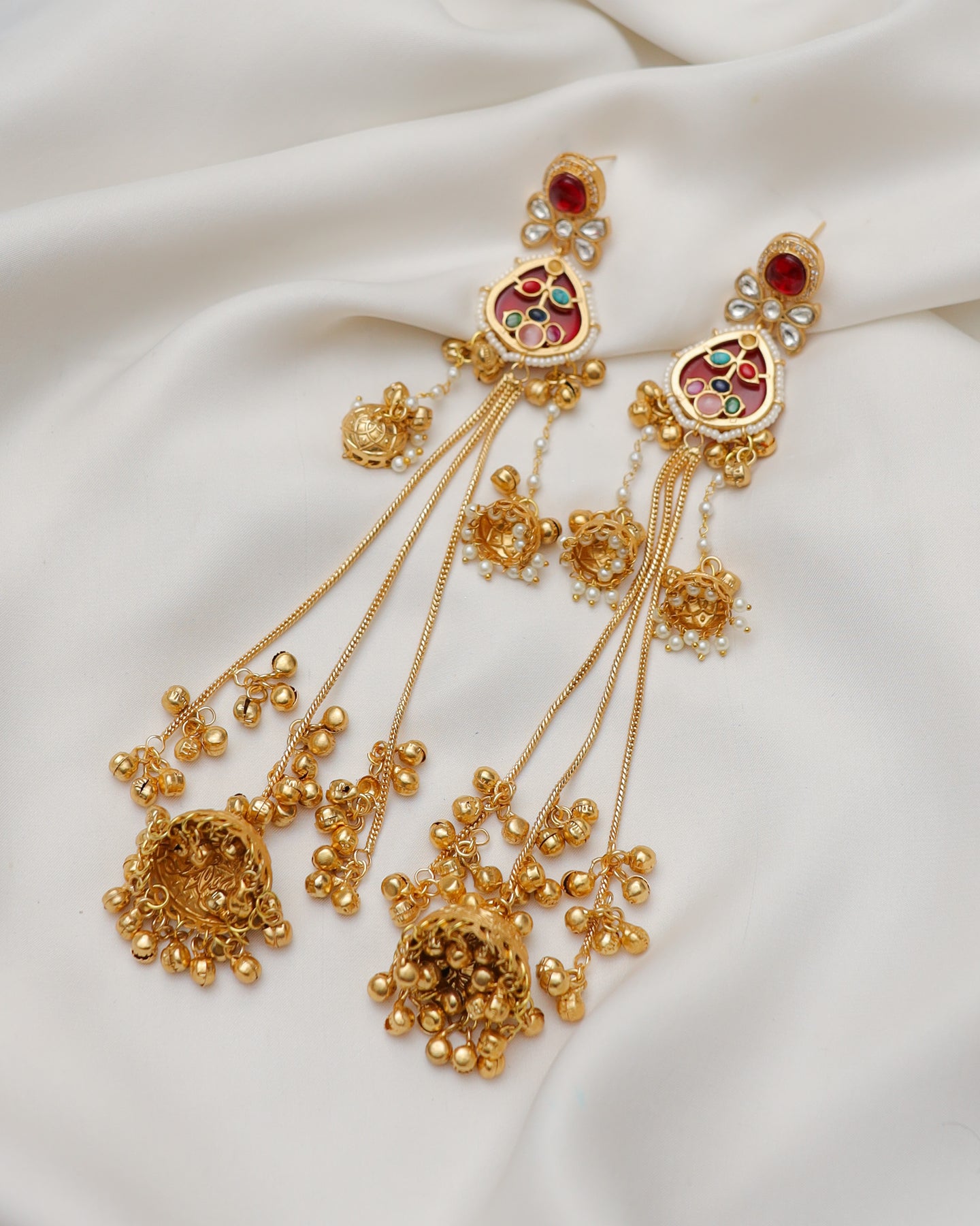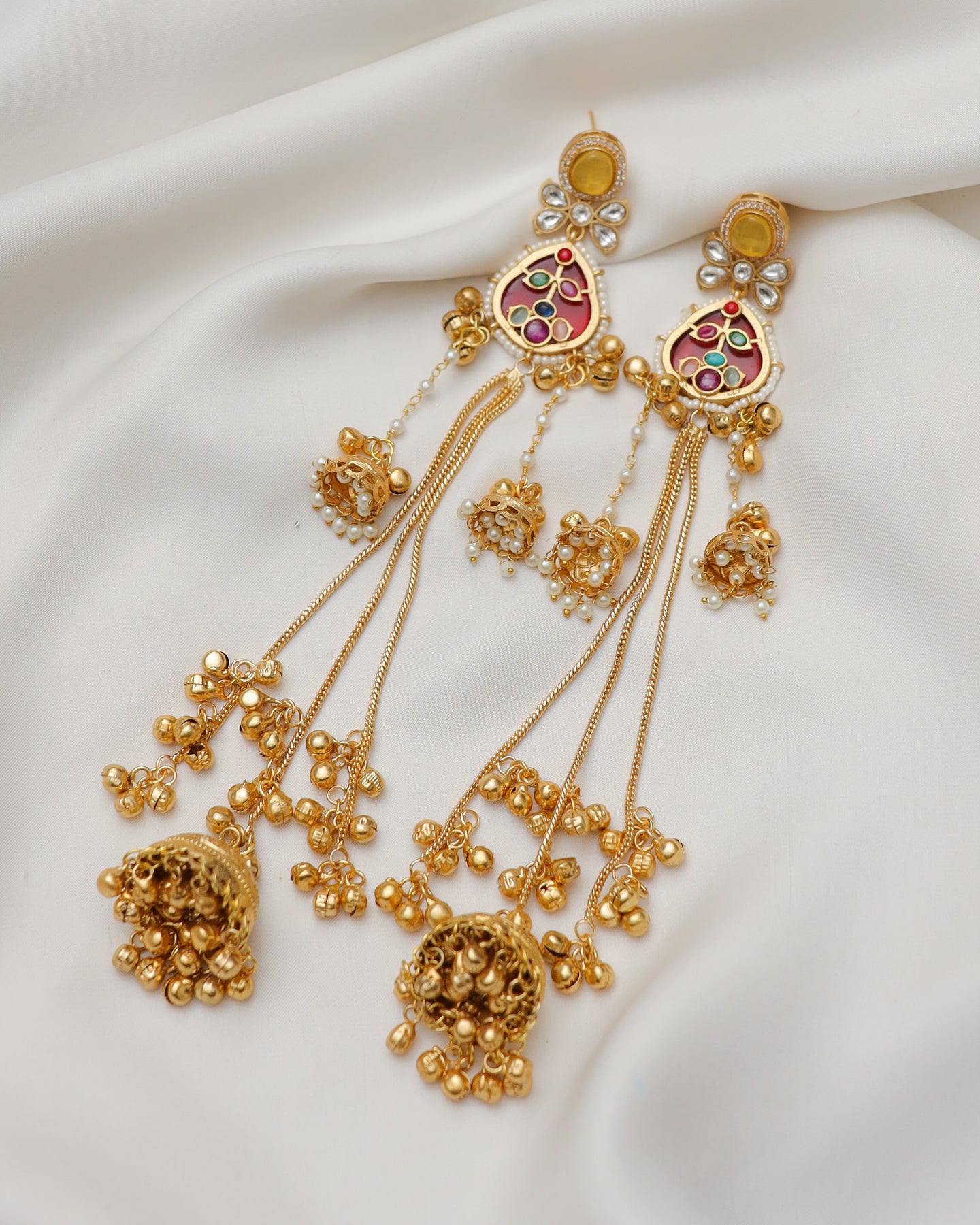 These Tajdar Jhumri Tassel Earrings are a timeless blend of Indian heritage and festive charm. Crafted in a rich antique gold finish, the earrings feature a delicate kundan centerpiece bordered with tiny pearl detailing. A soft blush-pink stone adds a graceful pop of color, beautifully balanced by cascading golden tassels adorned with ghungroo beads. Perfect for weddings, mehndi, festive occasions, and ethnic soirées, these earrings add royal elegance to both traditional and fusion outfits. Gold-plated on high-quality brass as base metal.