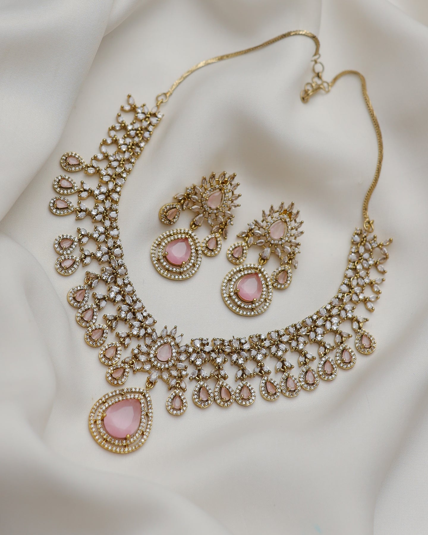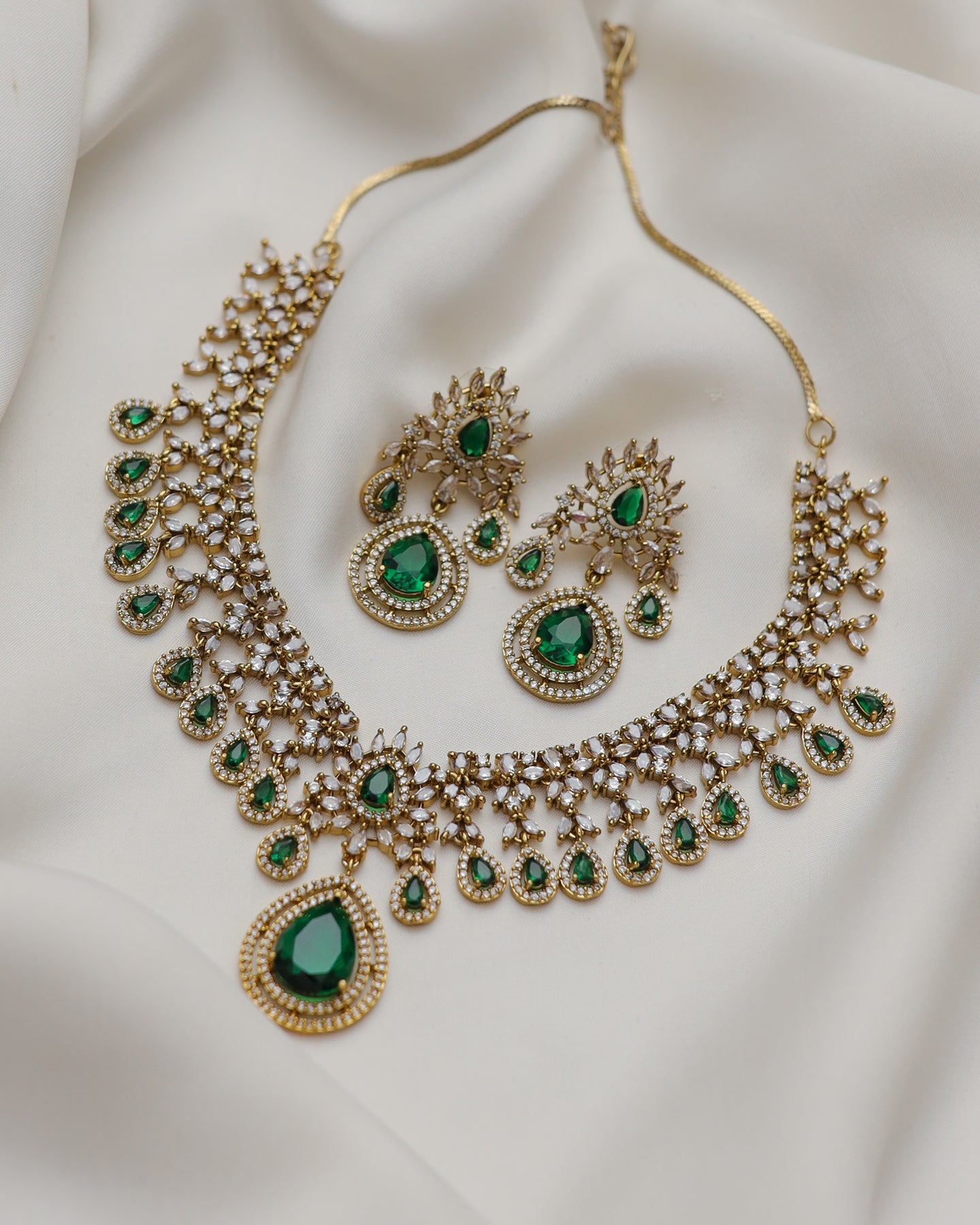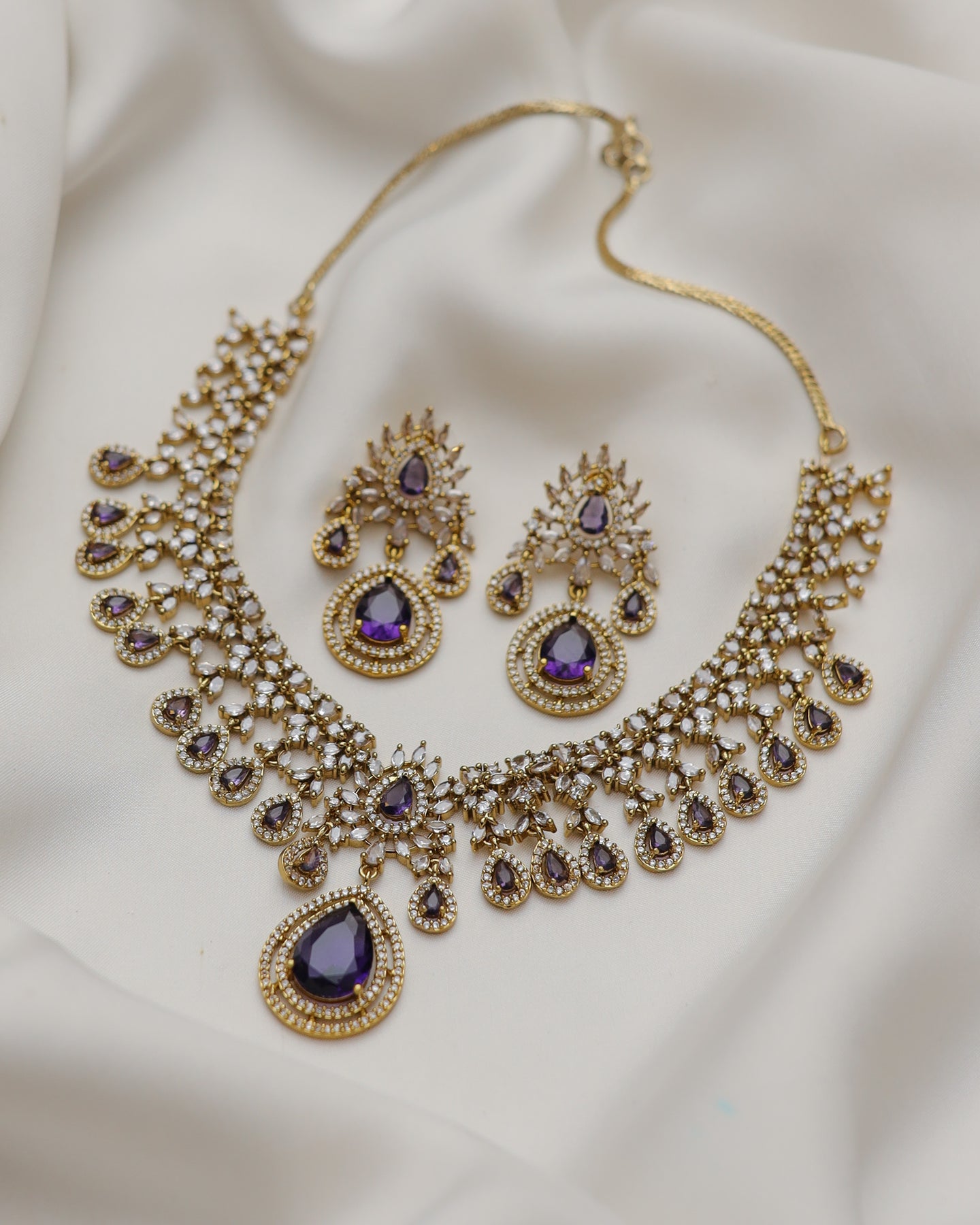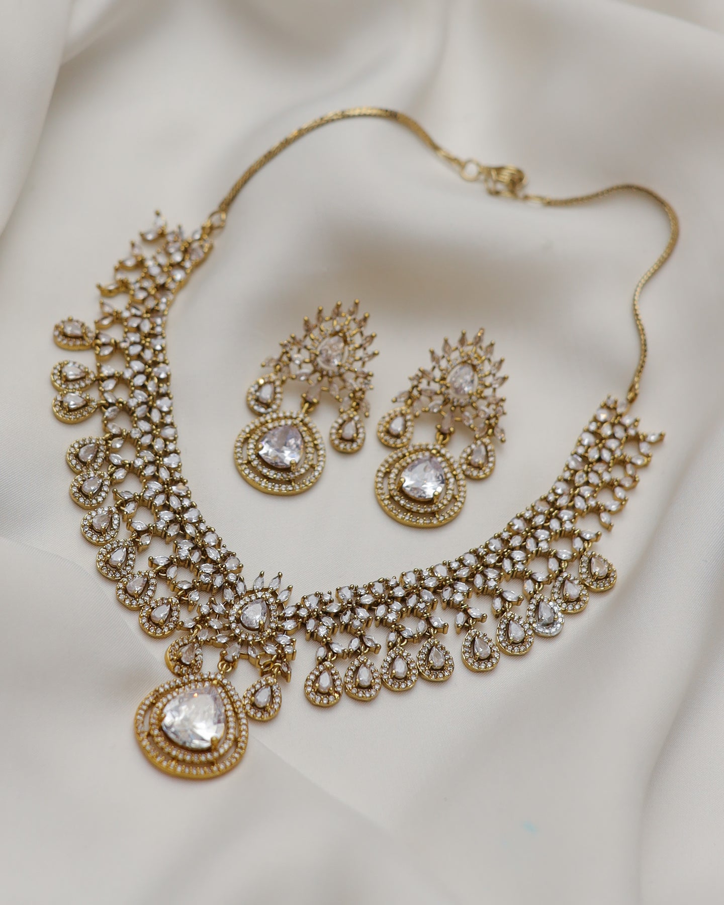 A regal statement necklace set featuring intricate gold-toned craftsmanship adorned with sparkling zircon stones and elegant teardrop crystal detailing. The highlight of the set is the bold pear-cut center stone, beautifully framed with delicate embellishments that create a royal, timeless look. Paired with matching long earrings, this set is perfect for weddings, festive events, and formal occasions.